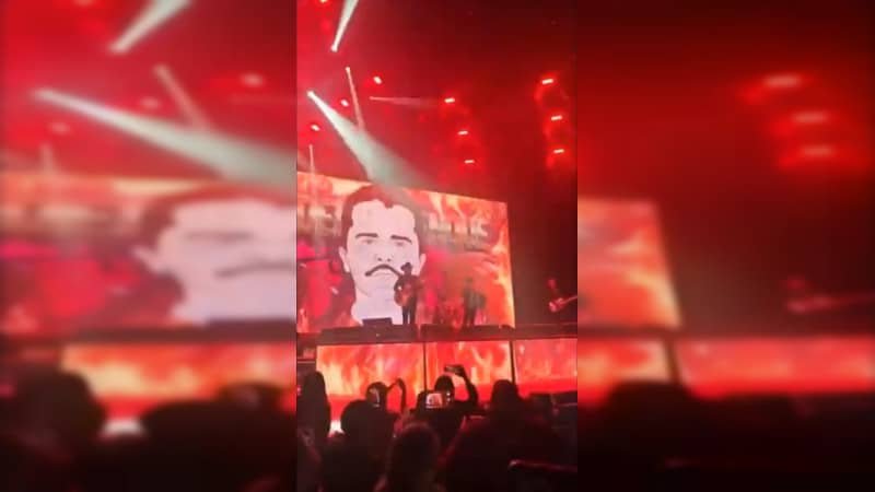 En el repertorio de narcocorridos apareció la canción “El Dueño del Palenque”, en la que se proyectaron fotografías del líder del cártel de las cuatro letras, una de ellas pertenece al arresto del capo en Estados Unidos, durante los años 80.